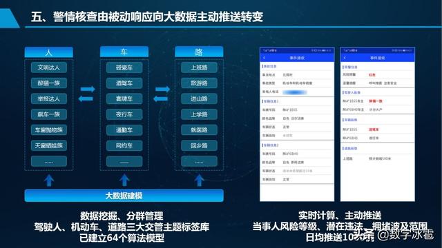 深入挖掘大数据潜力,创新提出人、车、路三大交管主题标签库,实时计算当事人风险等级,预测拥堵波及范围,挖掘潜在违法行为,并将上述生成的全量数据实时推送至民警掌心,用大数据武装基层民警。