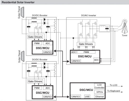 家庭太阳能逆变系统中,飞思卡尔的处理器、微控制器产品,如MC56F84XXX、MC56F82XX、56F803X等等产品,为整个系统带来可行、高效、可靠的电源转换方案。