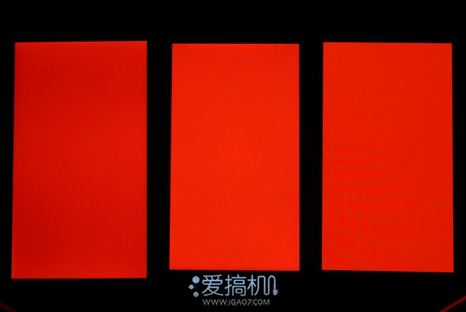 小编当然没有把右边的手机拿走…黑色是Super AMOLED的传统强项,G2和小米3则分别在左下角和右下角有漏光现象。