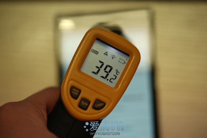WiFi上网20分钟,正面最高温度39.2摄氏度,背面最高温度37.1摄氏度▼