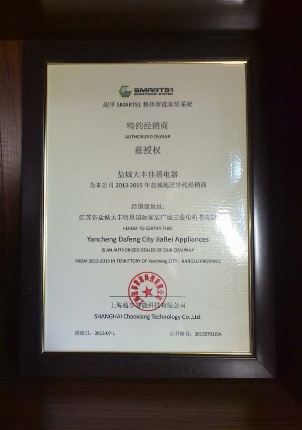 超享SMART51智能家居大丰明星国际家居广场体验店开张 作为上海超享SMART51整体智能家居系统盐城大丰销售商,大丰佳蓓电器销售公司在大丰市的首家实景智能家居体验店现已在大丰明星国际家居广场全新开张,佳蓓电器销售公司是一家盐城地区专业从事空调、地暖、新风、水净化及软化处理的暧通舒适系统销售商,随着高档家装发展的需求,他们在推广传统的暖通舒适控制系统的过程中,经常有当地终端客户提出空调远程控制,整合式全宅智能化控制,手机智能控制全宅的需求,公司领导敏锐地嗅觉到全宅智能家居的商机,智能家居已经势在必行。