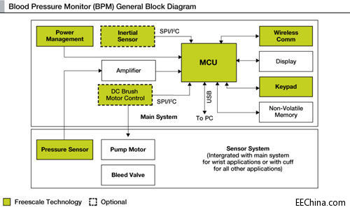 家庭自动血压计正在被越来越多地用于高血压的诊断和管理。家庭自动血压计包括臂式和腕式单元。图1演示了典型血压计的系统模块框图。可在http://www.freescale.com/medical下载该模块框图和其他图表。