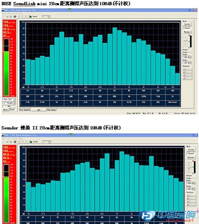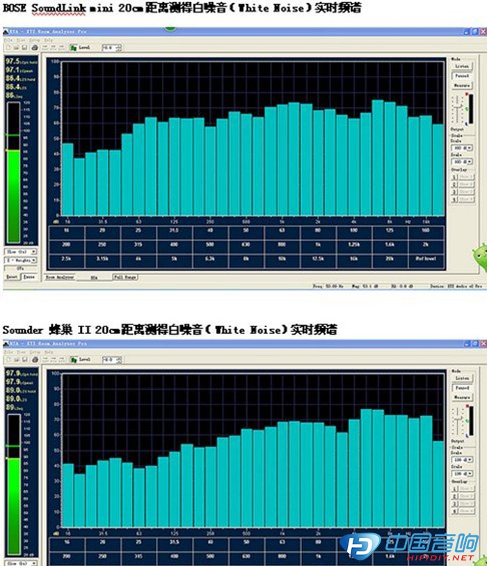 白噪声即是指功率谱密度在整个频域内均匀分布的噪声信号,通过对比不难发现,BOSE Soundlink mini在50~200Hz频段有所加强,这固然为其赢得了音色丰满低音浑厚的名响,但也为其存有轰鸣声,语音的清晰度与可辨度变差埋下伏笔.而Sounder蜂巢II在音色的取舍上显然获得了更好的平衡.