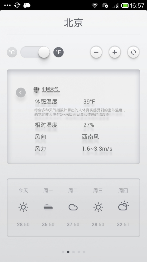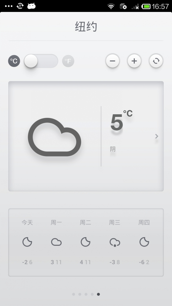 左上角的按钮可在摄氏度与华氏度之间切换,切换效果别致,有点老虎机的感觉;在两个城市之间左右滑动切换时也有轻微的过渡效果,简单不失细节的一款产品。由于不便展示,建议亲自尝试。