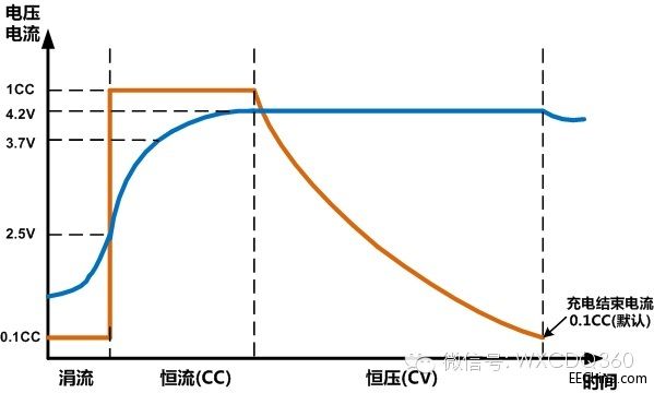 业内一般对电池的充电过程分为三段:涓流、恒流、恒压。