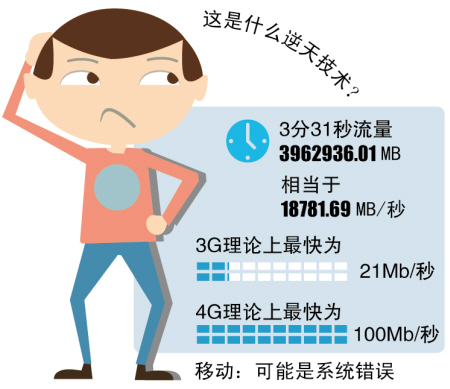 一张从中国移动湖南公司浏阳分公司打出来的GPRS详单上清楚地记载着,今年3月7日,一用户以CMNET/3G方式上网,时长为3分31秒,产生的流量 为3962936.01MB,通信费为39629.36元。看到这样一组数字,今年57岁的浏阳市居民李女士半天没有缓过神来:1分钟1万多元,这个天文数字是怎么产生的?