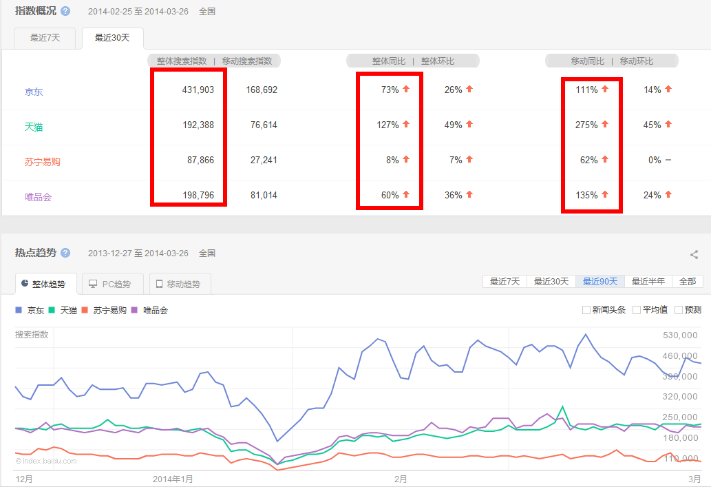 上图是过去30天京东、天猫、苏宁易购、唯品会4家综合电商平台的百度指数趋势图,从图中我们可以看到京东、天猫、唯品会的搜索指数都有非常大的提升,最近30天同比分别增加了73%、127%、60%,在移动端的增长趋势更加惊人,分别同比增长了111%、275%、135%,而第三大综合电商平台苏宁易购最近30天却仅录得8%的同比增长,对比去年12月的数据,竟然还呈现下滑趋势。显然,苏宁易购离第一阵营的距离越来越远了,即使在第二阵营中,也正在被唯品会等电商新秀们们快速迎头赶上。