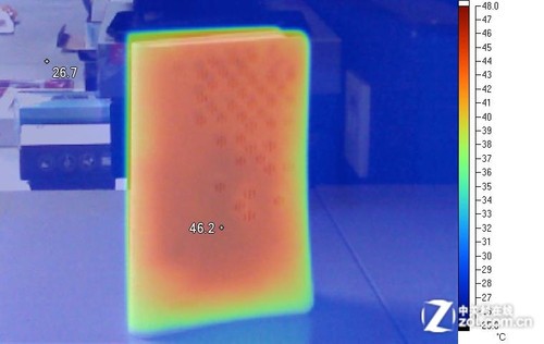 在50℃恒温恒湿箱中测试小米路由的稳定性 测试结束后,将小米路由从50℃的恒温恒湿箱中拿出,热成像仪获得的记录如下,小米路由的最高温度点达到了53.2℃,竟超过了测试环境的温度,用手触碰可以感到明显的热量。由于开启小米路由后,其内置硬盘也会自动进行运转工作,整机的发热量明显较大,虽然塑料材质的机身采用了多空隙的栅栏式设计,但散热效果并不显著。