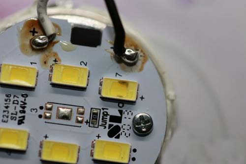 微距看看,就是这颗灯珠坏了,导致灯不亮了。这样来看,的确这个LED电源的寿命很长,标称100万小时都不为过,但LED能承受市电50HZ的纹波吗?