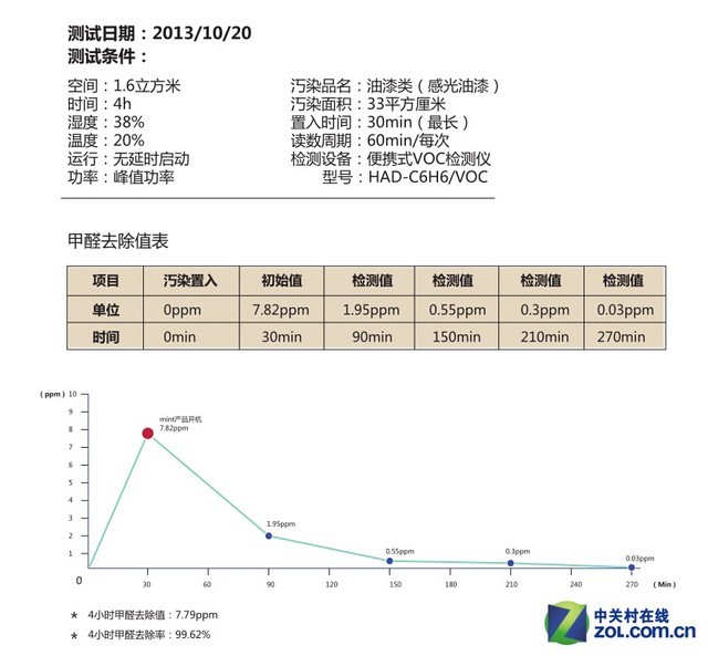 甲醛去除测试 甲醛去除测试: 在甲醛测试中,初始污染浓度为7.82ppm,经过4小时净化,室内甲醛浓度降低至0.03ppm,四小时甲醛去除率达到了99.62%。