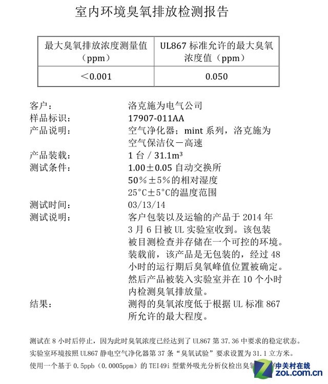 由美国UL提供的臭氧释放测试 臭氧释放测试: 洛克施为严格保障安全性能,在mint系列空气保洁仪上还独创了磁约束技术,对臭氧进行控制。经美国UL试验室出具的报告显示,洛克施为空气保洁产品的臭氧释放量低于0.001ppm,为全球同类产品最低值,仅相当于美国国标的1/50,中国国标的1/100,保护用户安全。 产品:mint-IM-R55PS 洛克施为 空气净化器4 将环保进行到底 无虑网未来净化趋势