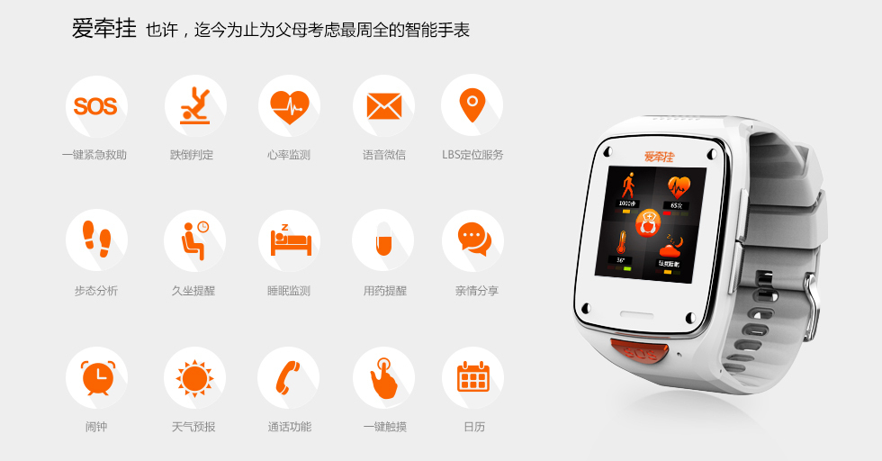 当你需要开锁时,只需轻按屏幕挂锁就会从睡眠模式中激活,并开始搜索蓝牙连接。当检测到与其配对的智能手机时便会自动弹开。考虑到偶尔会遇到电池耗尽或没带手机的尴尬情况,Noke 还预备了一个手动解锁码以避免尴尬。 目前 NokeKickstarter 上有上有 Kickstarter 上进行众筹,尽管距离活动结束还有近一个月的时间,但它已经筹得了 10 万多美元,完成了之前所设定的目标。 真正傻瓜式的老年人智能手表爱牵挂 爱牵挂是广州柏颐信息科技有限公司开发的一款智能手表,主要针对老年用户。从爱牵挂现在的产品来看,产品的功能其实挺多、挺全。但其中还是有一条很清晰的产品思路主线的,那就是主打感情牌,将孝心实际落地。不了解爸爸妈妈的身体状况,不了解爸爸妈妈的生活状态,与老人没有“吃了么”以外的话题,怎么办?爱牵挂就把爸爸妈妈的身体健康情况、行动轨迹记录下来,推送给子女。老人与儿女没有互动,怎么破?爱牵挂也想到了这一点,想要老人了解自己的生活,那就直接把自己的照片分享到云端,供老人在手表上直接查看。