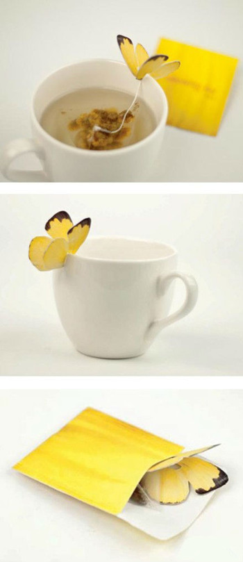 Tea),茶包挂绳的另一头是纸做的蝴蝶,泡茶的时候,这蝴蝶可以卡在茶杯边沿上,像挂钩一样把茶包线挂住,方便处理茶包,又增加美感。