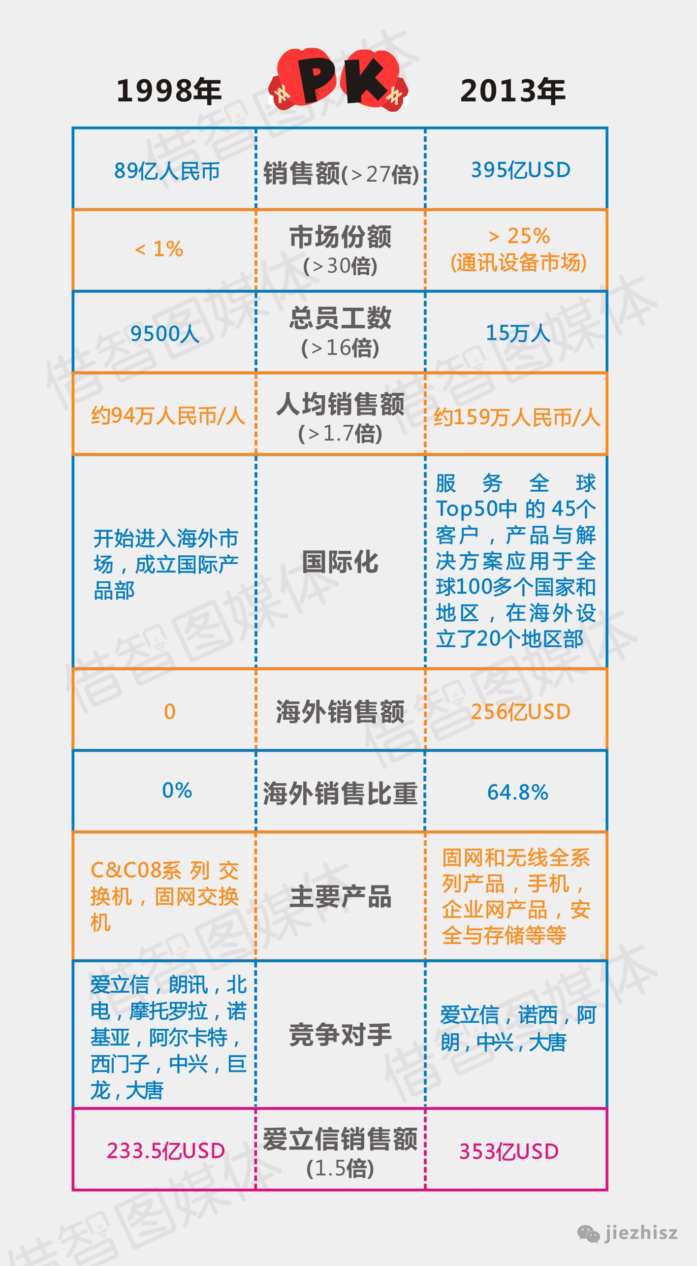 未来在哪?华为从战略规划、研发体系、营销体系,进行了内部分析和企业规划; 反省后,在迷茫中做出“走对路、选对人、建流程、永创新、重激励”的选择; 此后,华为创造出“三权分立”和“三优先”原则上的干部选拔机制; 业务流程梳理出三条主线:客户需求产品规划开发(ITM)、市场线索机会投标合同订单(LTC)和客户网上投诉(ITR); 回顾过去的26年,华为1998年销售额到2013年销售额,已从89亿人民币增长到395亿美元,增长近30倍。