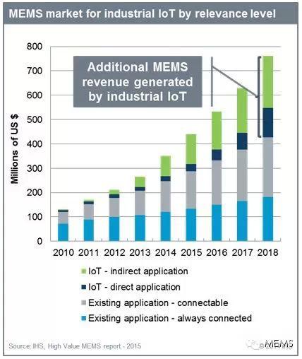工业物联网MEMS市场营收 IHS预测,全球 MEMS 工业IoT市场在2013年时约有18亿只,可望在2015年时增加到73亿只,包括独立式节点、控制器以及一系列范围广泛的基础设施应用,从智慧卡到商用运输到工业自动化到照明以及医疗保健等。