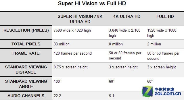 Super Hi-Vision完整的规格说明(4K并没有细致的规格) 超高清8K标准原生分辨率达到惊人的7680×4320,这个分辨率是是4K标准的4倍,是1080p全高清标准的16倍。考虑到DVD升级至1080p清晰度提升了7倍,从1080p升级至4K仅有4倍而已,升级幅度并没有预想中的明显,因此Super Hi-Vision技术规格中的8K才是更为合适的替代标准。目前,日本NHK公司正在努力实现2020年通过8K卫星信号来传输8K视频,并且具备完整的22.2声道技术。
