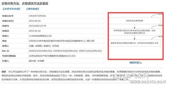 除此之外,小米还发布了多项关于智能家居的专利,其中包括“饭煲真空锅胆恒温装置”、“衣物分拣方法、衣物清洗方法及装置”、“水温调节方法及装置”、“一种进行转账处理的方法和装置”、“智能家居设备的控制方法及装置、电子设备”。在关于“衣物分拣方法、衣物清洗方法及装置”的专利中,记者发现该项专利涉及到了一种衣物分拣方法、衣物清洗方法及装置,“所述衣物分拣方法首先获取待洗衣物的图像,利用图像识别技术分析所述待洗衣物的图像,得到所述待洗衣物的衣物信息,其中,所述衣物信息包括如下至少一种:衣物类型、颜色、布料类型等信息。然后,根据获得的所述待洗衣物的衣物信息对所述待洗衣物进行分类,从而实现待洗衣物的自动分类,进而实现自动分类投放待洗衣物,为进一步提高洗衣的自动化做好了准备工作。” 前几日,小米公司披露了小米最新的手机销售量数据,截至2015年6月30日,小米上半年手机销售量为3470万台,同比去年增长33%,已连续5个季度居国内手机销量第一。 “3470万销售量是产品实际到达用户手里的产品销量数据。在2015年智能手机市场增速放缓的情况下,小米能在去年6112万总销售量的基数上保持33%的同比增长,可以说跑赢了大市,交出了一份极为靓丽的答卷。”雷军表示。 在智能手机市场增速放缓的情况下,小米是否将目光投向了其他产业?我们拭目以待!