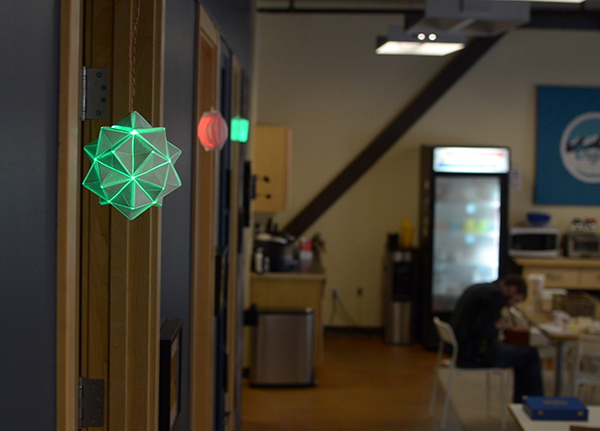How do you find private meeting space at the office in a moments notice? Meet Illumigami- a lantern that hangs outside a conference room door to elegantly communicate the availability of the room. Illumigami works with your existing Google Resource Calendar and updates automatically so you never have to guess which rooms are available. Check out the video to see its organizational awesomeness! Designer: Viget Labs