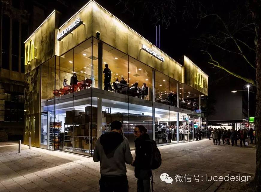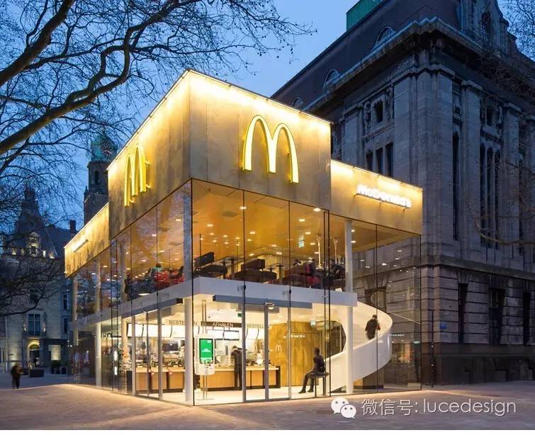 原创性的照明宗旨-空间分隔与氛围营造在深入调查鹿特丹的历史背景后,该建筑事务所为项目确定了三个主要元素:尊重、透明和优雅,以照明为线,相互衔接、融会贯通,巧妙地穿插在设计中。事实上,照明才是该项目设计的关键,在色彩的视觉辅助下,照明将建筑内外部融为一体,强化建筑的整体性,丰富店铺特质。该项目的照明设计极为原创性,根据具体空间而做出相应调整,在此条大街上点燃一盏庞大的灯笼。 在延续性的空间效果下,该餐厅显得没有内外部的空间分隔,因此照明承担了空间区隔的主要作用。白天户外的自然光与室内空间照明营造的温暖阴影形成对比,而晚上,整个建筑金碧辉煌,特别是在朝街道一面和屋顶区域,展示了照明设计的功效。这一设计不仅为室内装修、建筑和城市规划提供了有利条件,也成为快餐店成功的营销方式。得益于餐厅透明的结构特性,使得店内和外部的行人没有分隔开来的感觉,日夜吸引消费者前来就餐,从而实现了24小时营业。从而,在灯光的烘托下,建筑材料和透明玻璃勾勒出店铺轮廓,使其在街道中央脱颖而出,完美呈现了足以媲美舞台效果的照明设计。 “白天吸引购物人群,夜晚借助完美的照明迎来夜生活的人们”。 结语新颖而有效的设计,使邮局和其他相邻建筑完美呈现其紧凑的岩石外观,彰显了其重要地位。在该项目中,照明是其成功的关键,使材料的轮廓不再呆板,充满了活力,充分发挥了巨型灯箱的功能,使得这座几个月前还因建筑构造拥挤丑陋而被拆除的店铺,恢复了魅力、实现了价值。Mei 建筑事务所的设计师们表示:“要让该空间重现活力,就必须重新设计麦当劳并使其融入周围环境”,结果也是众望所归。