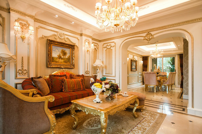 巴洛克这个词最早来源于葡萄牙语,意为“不圆的珍珠”,最初特指形状怪异的珍珠。而在意大利语中有“奇特,古怪,变形”等解释。在法语中有“俗丽凌乱”之意。巴洛克风格以浪漫主义的精神作为形式设计的出发点,它不似古典主义的刚劲、挺拔、肃穆,它追求宏伟、生动、奔放的风格,更为亲切、柔性。 巴洛克的装饰风格喜用浓墨重彩,强调力度和变化,沙发华丽的布面与精致的雕刻互相配合,高贵的造型与地面铺饰融为一体,气质雍容。使用各色大理石等装饰使之华丽、壮观。拱形门也是一大亮点,门面上明显的凹凸感,带着流畅优美的线条,使的整体门透露出一股浓郁的时尚味,给人大气、华丽之感。 茶色的沙发豪华大气,像一个肃穆庄严的长者,加上同样色系的装饰物,一股浓浓的高贵感油然而生。吊灯也是极具格调的,欧式烛台吊灯这种吊灯是欧洲古典风格水晶吊灯的一种,灵感来自古时人们的烛台照明方式,那时人们都是在悬挂的铁艺上放置数根蜡烛。如今很多吊灯设计成烛台的样式,只不过将蜡烛改成了灯泡,但灯泡和灯座还是蜡烛和烛台的样子,弯曲的灯架搭配与墙面呼应的白光尽显高雅。咖啡色的地板是一大亮点,吸收了咖色沙发和饰物的优雅,又把吊灯的白光柔和地反射出来,给人一种静谧光洁之感,整个环境显得更加典雅、高贵。 贝尔卡布基诺系列地板,经典的咖啡色把华丽和优雅相结合,尽显奢华巴洛克风格。