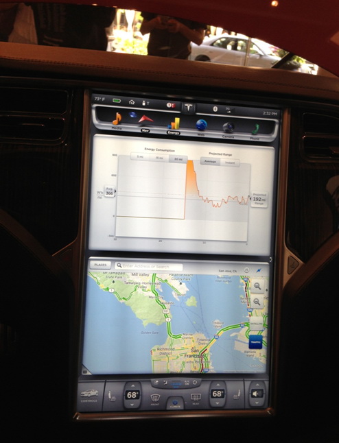 车里没几个物理按钮,正中间17寸的触屏全take care了。在一般的车里,我们需要通过n个分布在不同地方的按钮才能操控的空调、音响、天窗、方向盘力度etc.,这块17寸的触屏中控台全都能搞定。这货基本就是一个平板电脑,操作不能更直观了;会用智能手机的人玩儿两分钟就全会了。